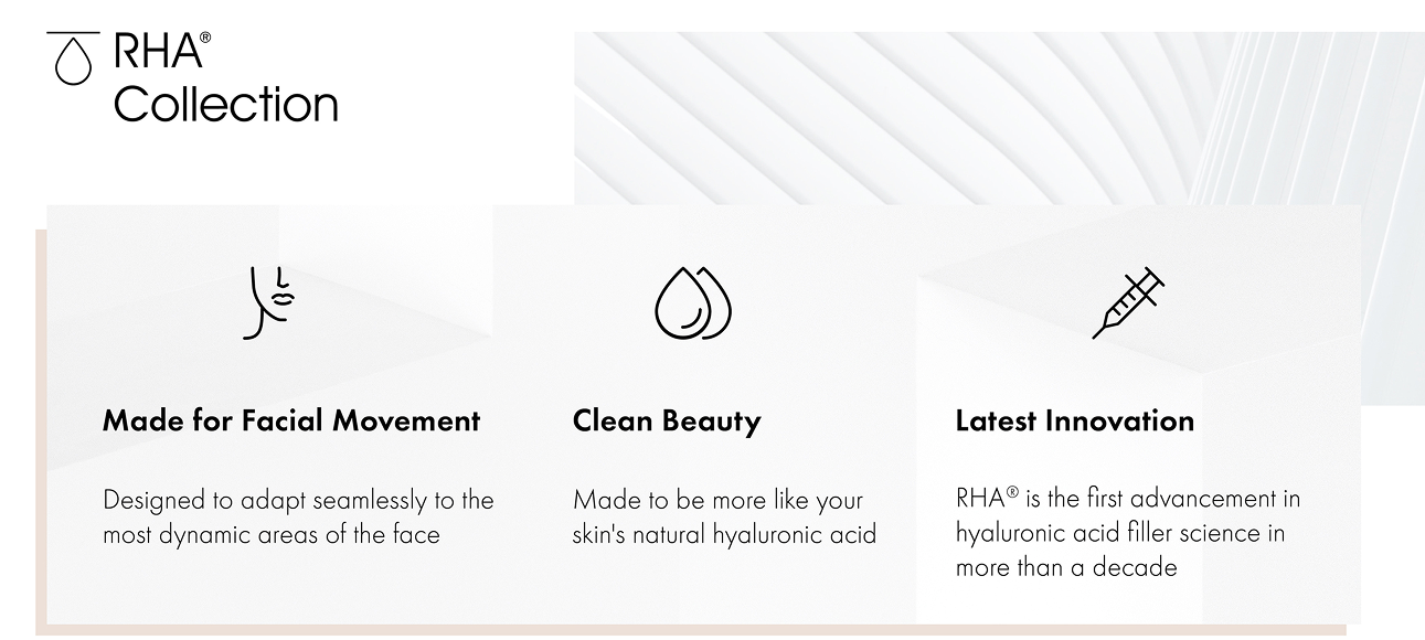 We are an exclusive provider of the RHA® Collection of fillers. This new designer filler more closely mimics your skin’s hyaluronic acid and adapts to your dynamic facial movement – for a natural look.